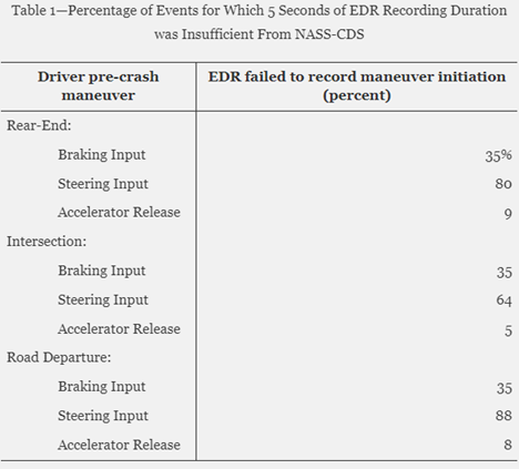 This is interesting. More interesting to us, however, is that in evaluating EDR recording time for causation analysis, NHTSA also found that “a better understanding of the driver’s pre-crash behavior will also assist in the evaluation of emerging crash avoidance systems (e.g., lane departure warning, lane keeping assist, forward collision avoidance, automatic emergency braking, and intersection safety assistance systems).” While undoubtedly true, NHTSA’s continued focus on EDR data alone actually ignores an entire category of data that would be even more useful in assessing these advanced crash avoidance systems as well as accident causation—i.e., Vehicle Performance Data (VPD).